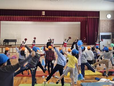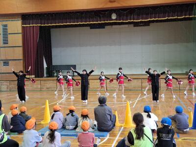 今年度は野球応援の披露からはじまり、ジャンボリミッキーを小学生と一緒に踊り、小学生からの質問を受け付けました。「どうしてそんな大きな声が出るのか」「ダンスのキレをどうやって出すのか」「唯一の男子部員は女子たちとどう仲良くするのか」などたくさんの質問が寄せられました。