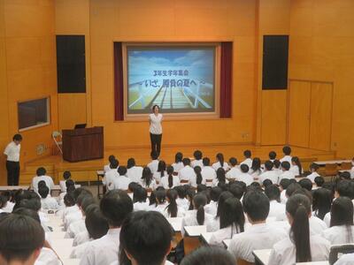 9月2日(火)7限に3年生は視聴覚ホールで共通テストの出願に関する説明会を行いました。本年度から出願方法がネット出願となり、昨年度とは大きく変わりました。各自が取り寄せたりダウンロードした要項を持参し、それを読みながら進路課長から細かな説明と注意事項がありました。その後教室に戻り、マイページ登録を正副担任の確認のもとで行いました。いずれも本年度からの要項によるもので初めてのこととなります。細心の注意を払いながら、間違いの無いように作業を進めました。今後も出願に関する手続きが続きます。共通テストまであと約4ヶ月となり、いよいよ本番という気持ちになります。3年生の努力が実るよう応援しています。
