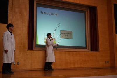 1月27日(火)科学探究科1年生によるミニ課題研究校内報告会が行われました。ビタミンCに関する課題研究について、英語を用いたプレゼンテーション、質疑応答を行いました。探究プログラムⅠやSEC(Science English Communication)の授業、放課後の時間を使って発表の練習をして臨んだ本番では、自分たちの研究内容について聴衆の皆様に伝えることができたようです。質疑応答では、質問者の意図する内容について英語で返答することに苦戦する場面もありましたが、本プログラムを通して英語でのコミュニケーション能力が見につきました。今回のプレゼンテーションで終えることなく、今後も英語でのコミュニケーションを活発に行っていきます。