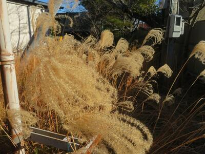 唐瀬街道沿いにある複数の松の木は早くも新芽の準備ができています。グラウンド側にある市高の校歌にもでてくるアカシアの木は花のつぼみができています。春になると黄色い花が咲きます。また弓道場の脇ではススキの穂が秋の名残を惜しむように風になびいています。