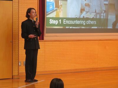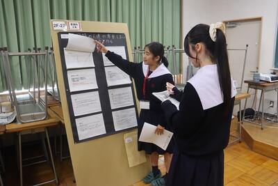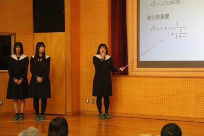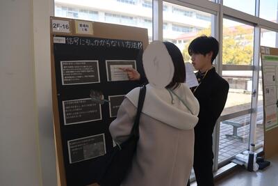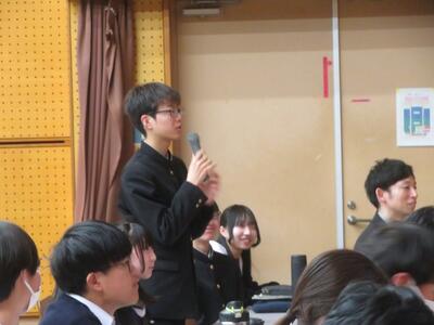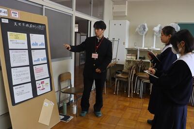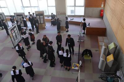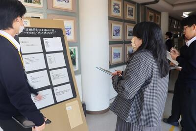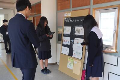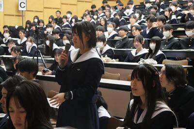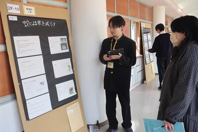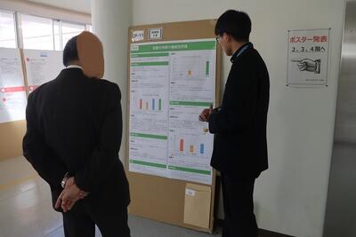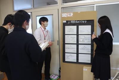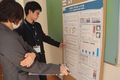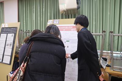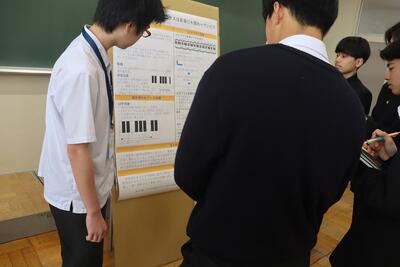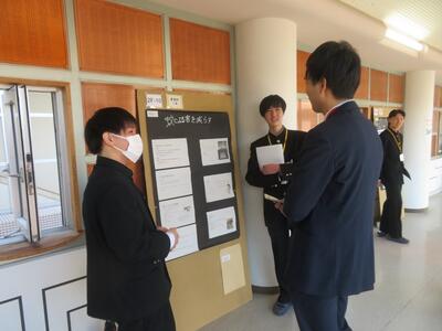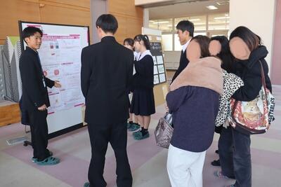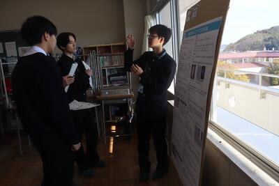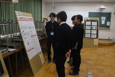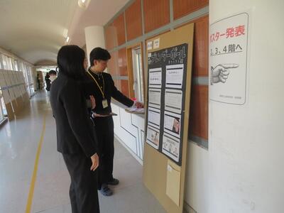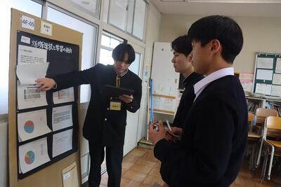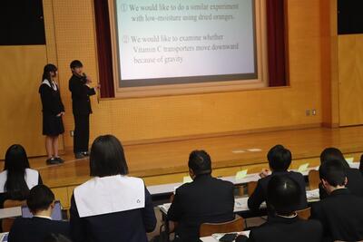 科学探究科、普通科合わせて約200のゼミグループによるポスターセッションが中央館3、4階全教室と中央館、東館、本館2階の廊下や特別教室で行われ、生徒全員がこの1年間取り組んできた研究成果を熱く発表していました。それを聞いた生徒達は率直な感想をリフレクションカードに記入していました。一方、視聴覚ホールでは3部入れ替え制でセレクションを通過した1、2年生の科学探究科、普通科合わせて12のゼミによるステージ発表が行われました。そこでは3年生代表による英語によるスピーチもありました。質疑応答では積極的に多くの生徒が質問をしていました。ステージ発表には大学や教育機関の方々、本校科学探究科に来ていただいている留学生TAの方々などをお招きし、講評もいただきました。ありがとうございました。
