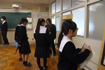 2月27日(金)、卒業式本番を前に予行が行われました。お昼過ぎに登校した3年生は、まず、各ホームルームに集合して、書類提出や本日、当日の説明などを受けました。その後、体育館に移動して、予行を行い、式当日の動きを確認しました。校歌も大きな声で歌うことができました。その後は、同窓会入会式を行い、同窓会役員の方から第78期の各クラス代表生徒が紹介され、生徒代表の挨拶がありました。その後は、3年生全員の名前が刻まれた銅板の除幕式を行い、最後は、再びホームルームとなりました。また、卒業アルバムも配布されました。