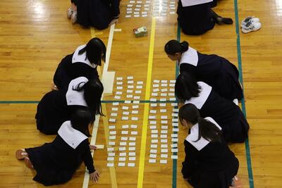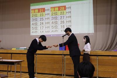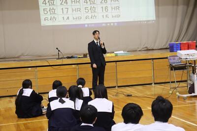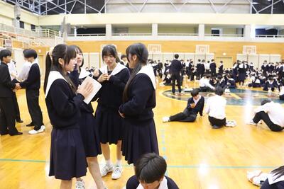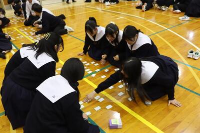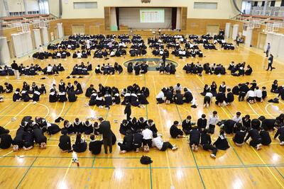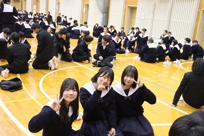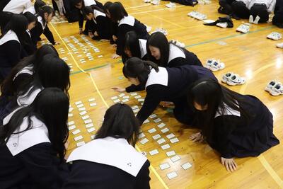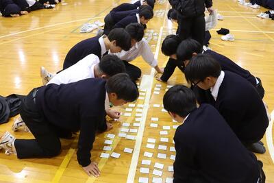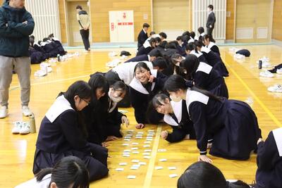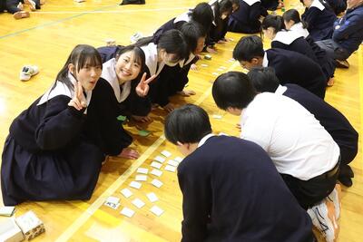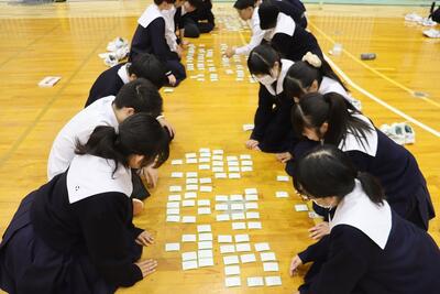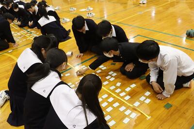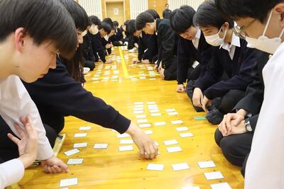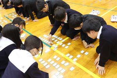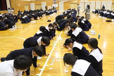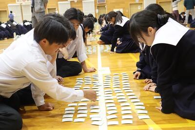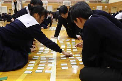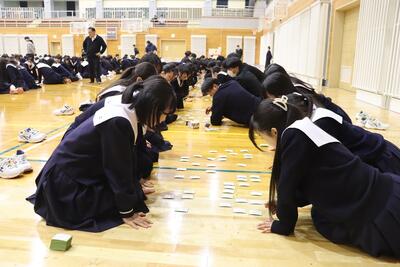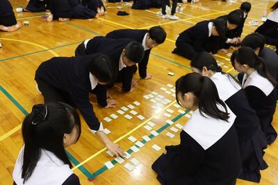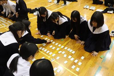 3月16日(月)体育館で1、2年生による百人一首大会を行いました。8クラスずつのトーナメントを2つ作り、その中でクラス対抗の班別源平戦という形で実施しました。本校の百人一首大会は上の句で札を取れなければ勝てません。それぞれの生徒が事前に札を覚えたり、練習もしてきましたのでレベルの高い熱戦が繰り広げられましたが、例年通り2年生が強く、上位を独占しました。文化的行事として充実した1日でした。なお優勝は21、28HR、2位が23、22HR、3位が27、25HRでした
