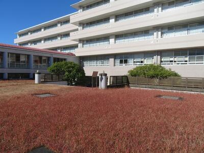 12月中旬ですが、市高の植物たちがきれいに彩っています。中庭(向学の庭)の草が紅葉して赤いじゅうたんのようです。テニスコート脇のモミジは今頃になって美しく紅葉しています。格技場横のツバキとナンテンが赤いコントラストを競っていました。今週も授業は続きますが、もうすぐ冬休みです。多くの植物の美しさが生徒や職員の心を和ませています。
